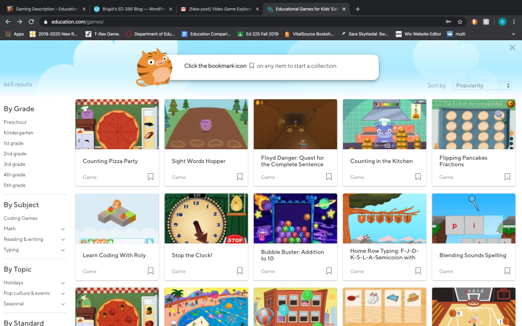 The website I chose for my project was education.com/games. There are many options to chose from. This website touches on every subject that would be taught in school. There are some extra games to play on this website but they are a majority of educational games.
